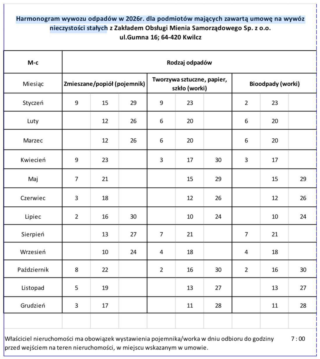 Harmonogram wywozu odpadów w 2026r. dla podmiotów mających zawartą umowę na wywóz nieczystości stałych
